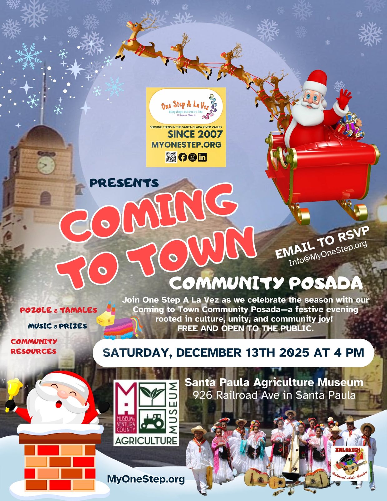 The Coming to Town Community Posada marks an important milestone—One Step A La Vez is now part of the Santa Paula community. For over a decade, One Step has supported youth across the Santa Clara River Valley through counseling, leadership development, advocacy, and community-building programs.