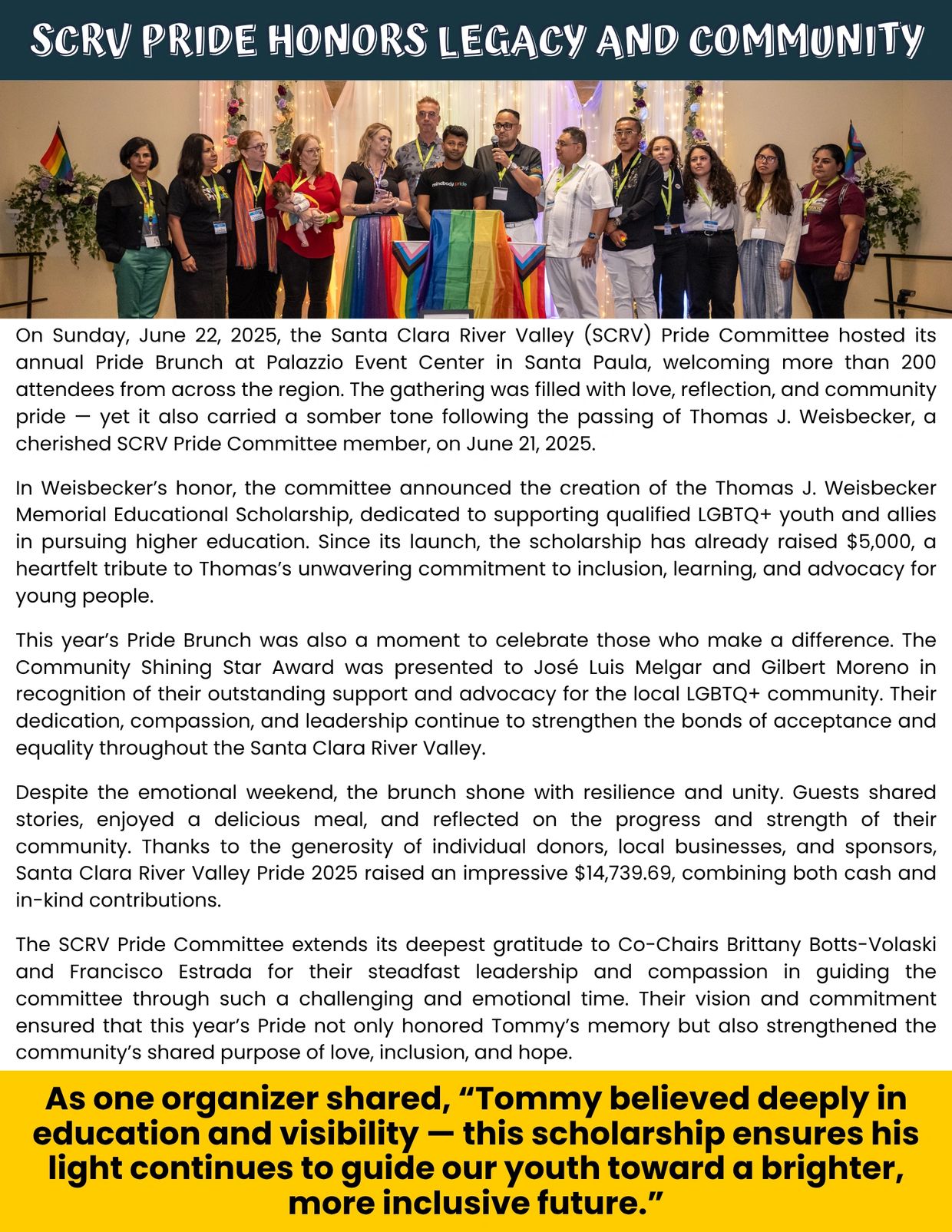 SCRV Pride Brunch will take place on Sunday, June 22nd, 2025, starting at 11:00 A.M. at Palazzio’s Event Center in Santa Paula, and will bring together community leaders, local businesses, and allies for a morning of inspiration, unity, and celebration.
